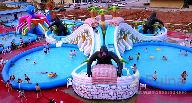 以猩猩林中搬運物品嬉戲為主題,人在林中穿梭,從而達(dá)到人景合一的境界;在設(shè)計結(jié)構(gòu)上是以三個對稱的滑梯組成,加上噴水的效果,給人以視覺上對稱的美感!每個滑梯下面都配有一個充氣水池,水池中放些水上浮具,如香蕉船、水狗、冰山等,讓移動水上樂園的玩法更加豐富。