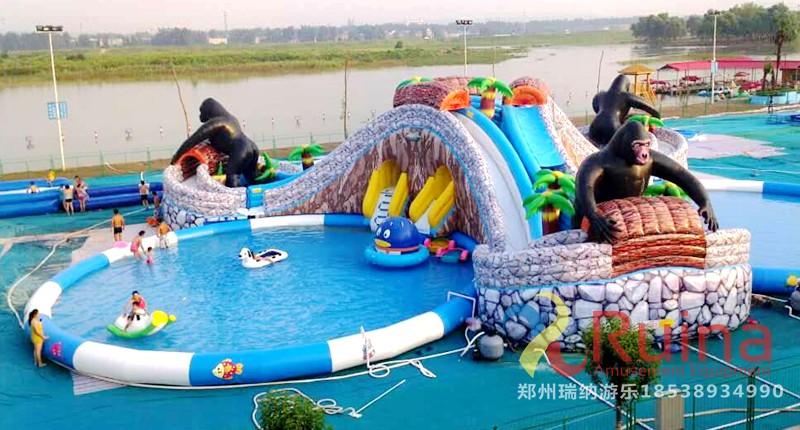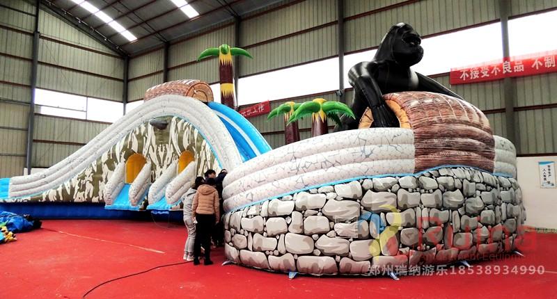 樂園中的三個黑色大猩猩造型被設(shè)計的異常逼真,讓游客忍不住會有前去和它合影留念的想法。滑梯的顏色則采用了和大山、巖石一樣的顏色,搭配及其合理,把花果山的造型形象的表述了出來,亦幻亦真,擁有如此優(yōu)美意境的一款全新移動水上樂園,相信將會給周圍游玩的人群帶來一種怦然心動的感覺,讓他們會產(chǎn)生一種前去游玩一番的沖動!