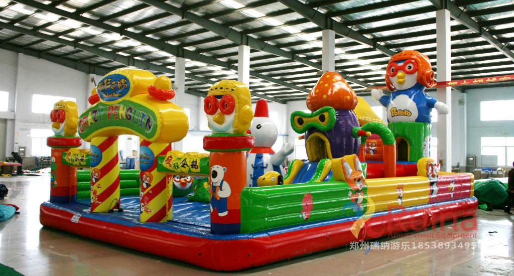該款企鵝充氣城堡制作過程采用了下料、縫紉、熱合、粘整等工藝,適用于學(xué)校,娛樂城、游樂園、超市、大型商場(chǎng)等兒童聚集地。企鵝造型異常逼真,栩栩如生,能夠強(qiáng)烈吸引著孩子們前去玩耍。這款城堡玩法豐富,可以滑、蹦、鉆、跳等,娛樂無窮。