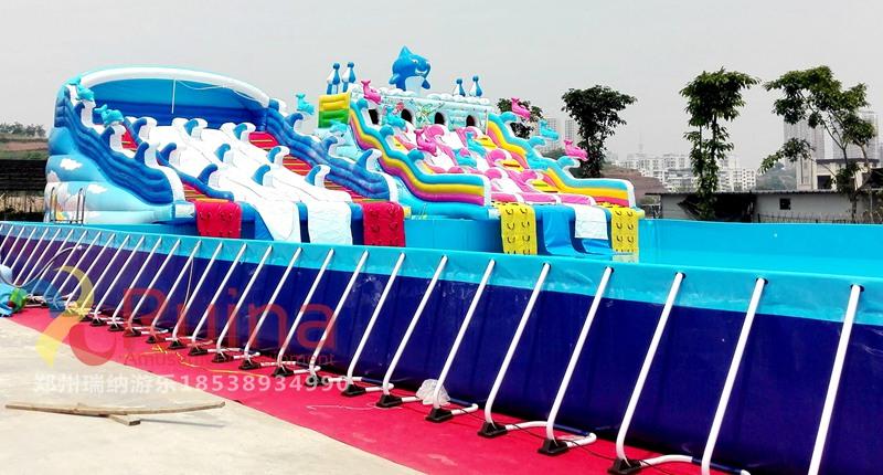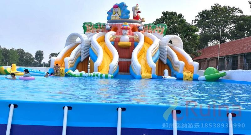 3、支架游泳池的游玩方式多樣,支架水池即可以和一些動(dòng)物卡通人物造型的水上滑梯組合使用,還可以將不同規(guī)格的支架泳池通過(guò)各種充氣模型玩具組合,組成一個(gè)集娛樂(lè)性、競(jìng)賽性的水上沖關(guān)闖關(guān)設(shè)備,可以調(diào)整支架游泳池位置來(lái)改變水上沖關(guān)關(guān)卡設(shè)置,豐富水上沖關(guān)的趣味性和耐玩性。